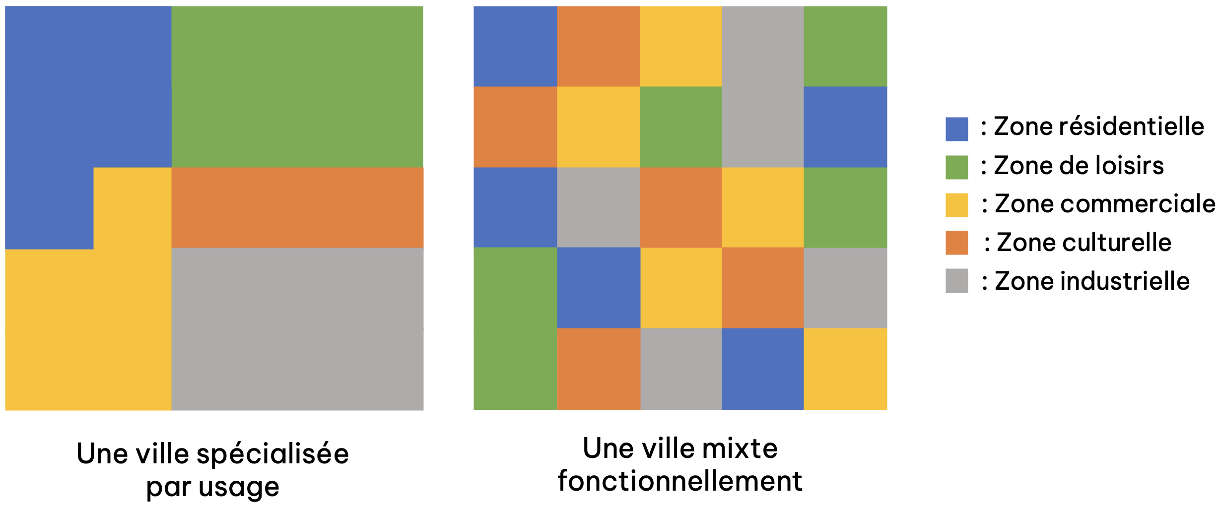 Représentation des concepts de “zoning” et de mixité fonctionnelle. Figure réalisée par Solal Jung (scity)
