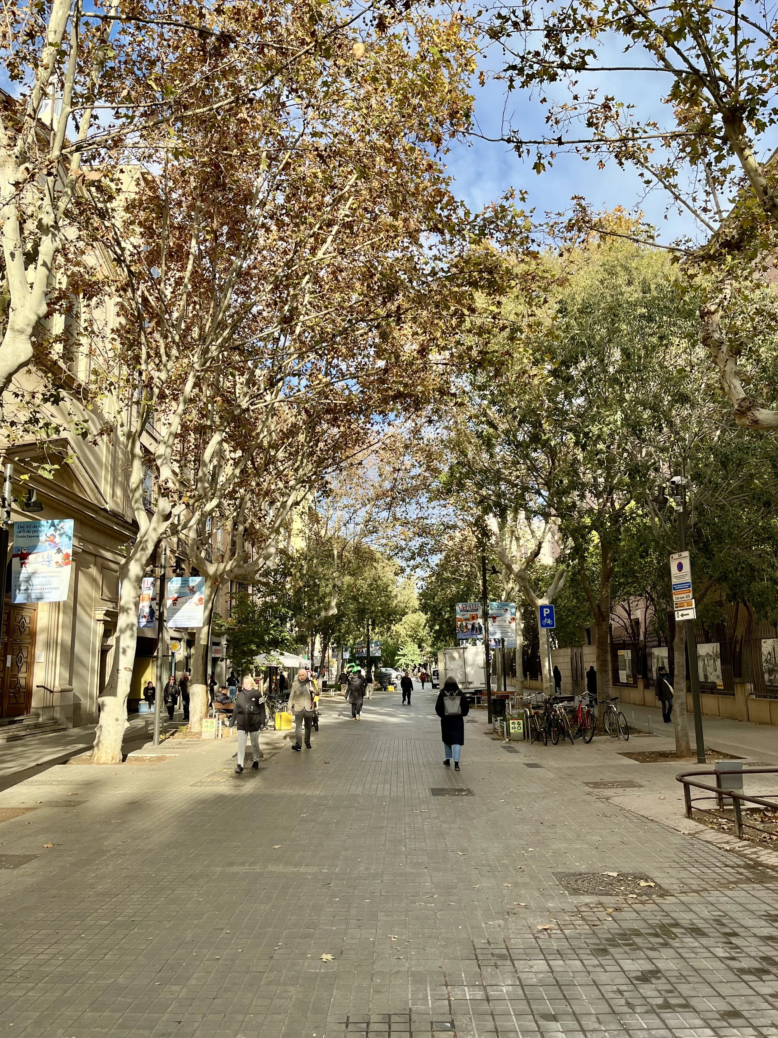 Une ville active doit favoriser le confort sensoriel et le sentiment de sécurité de la population pour encourager les modes de déplacements actifs. Rue piétonne pacifiée et végétalisée de Barcelone, Carrer del Consell de Cent, dans le cadre du projet des “superblocks”. Photos réalisées par Claire Daugeard (scity),