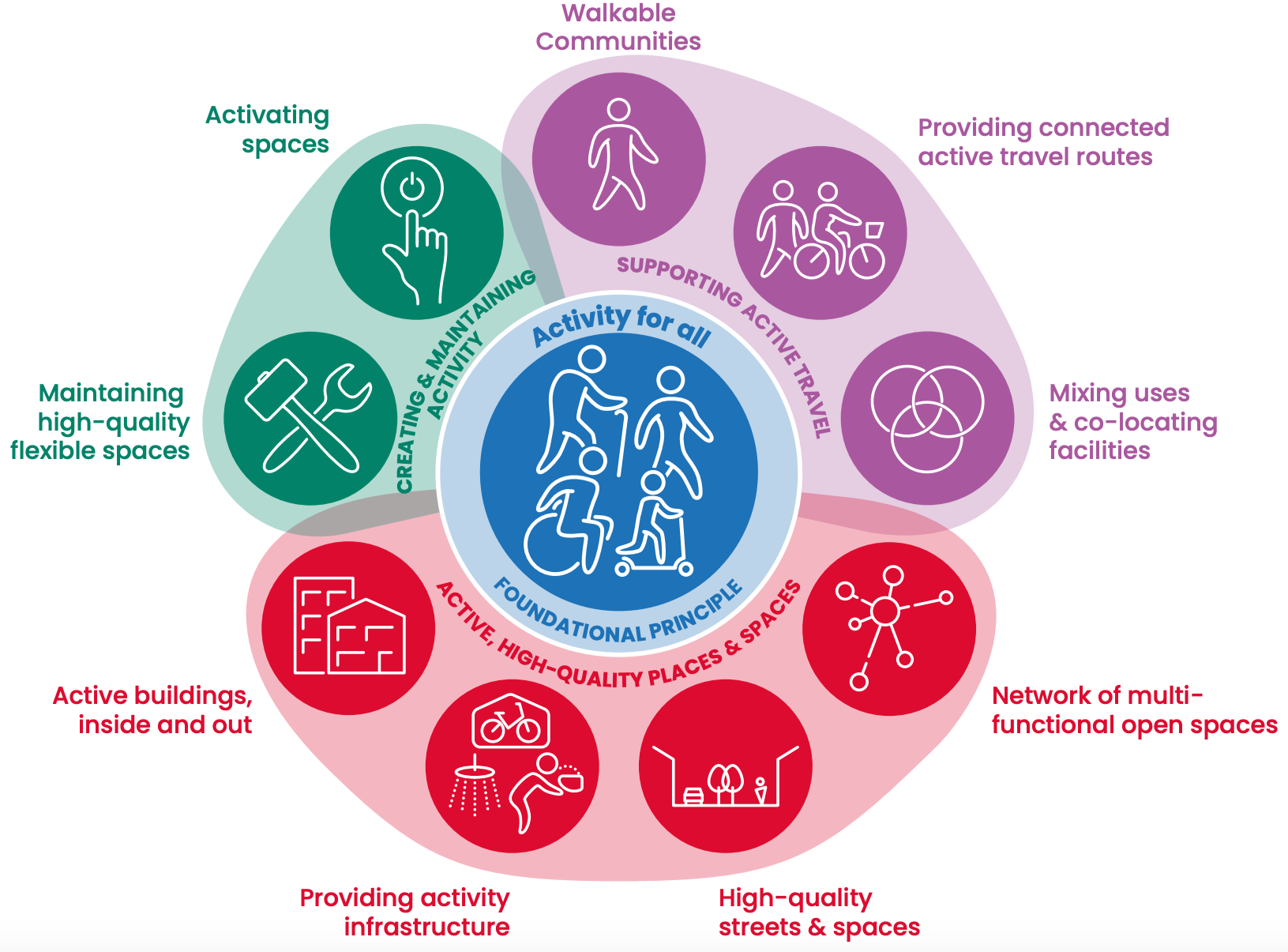 Les 10 principes de l’active design selon Sport England avec pour principe fondamental des activités doivent être inclusives et accessibles à tou·tes.